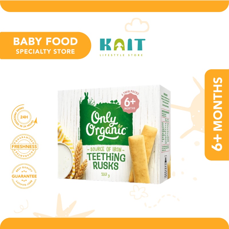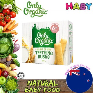 Only Organic Snack Teething Rusks 100g. Baby Toddler Kids. Only Organic - Organic Teething Rusks This classic recipe for teething rusks will keep your baby busy for a long time as they are baked to create a hard rusk perfect for babies teething as they encourage biting and chewing which aids in healthy tooth and gum development.