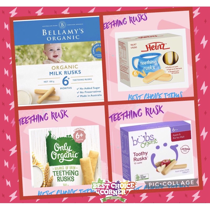 Only organic baby teething rusks 100g. Discard rusk if broken or chewed. BELLAMYS ORGANIC BABY TEETHING MILK RUSKS 100g MADE IN AUSTRALIA CERTIFIED ORGANIC. Our classic recipe for teething rusks will keep your baby busy for a long time as they are baked to create a hard rusk perfect for babies teething as they encourage biting and chewing which aids in healthy tooth and gum development.
